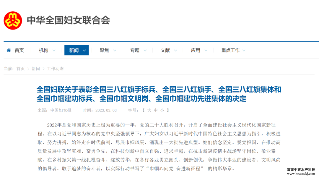 為表彰先進、樹立榜樣,3月3日,全國婦聯表彰了10名全國三八紅旗手標兵、298名全國三八紅旗手、199個全國三八紅旗集體、1992個全國巾幗文明崗、996名全國巾幗建功標兵、500個全國巾幗建功先進集體。其中,海南中正水產科技有限公司研發中心被授予全國巾幗建功先進集體。