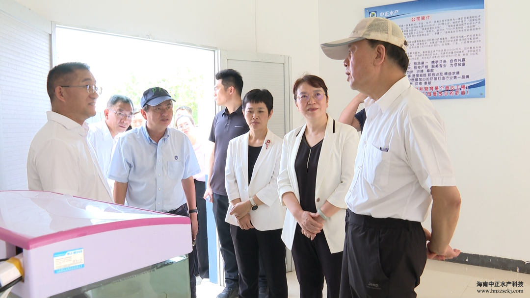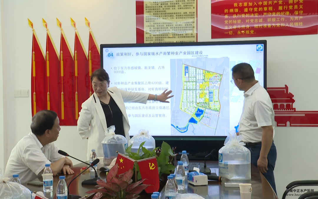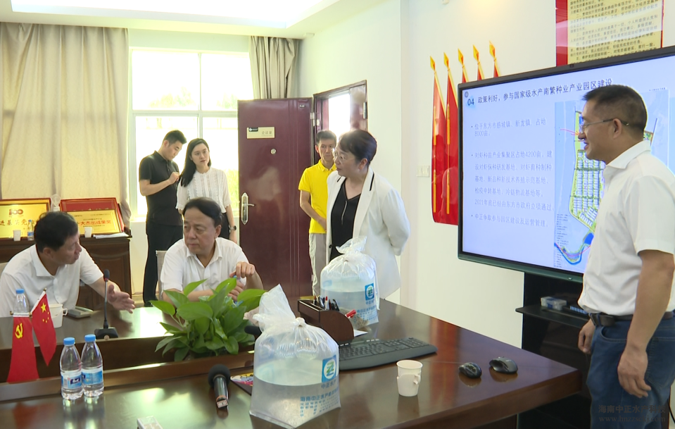 中正水產董事長雷夏雨介紹了公司發展水產種業過程中碰到的困難,也闡述提振水產種業的執著信念;東方市市委書記田麗霞介紹了東方水產南繁種業產業園的建設進度;中正水產副總裁王平從公司標準化生產、生物安保系統構建、對蝦育種進程等方面,向考察團匯報了公司的發展歷程以及取得的成果。